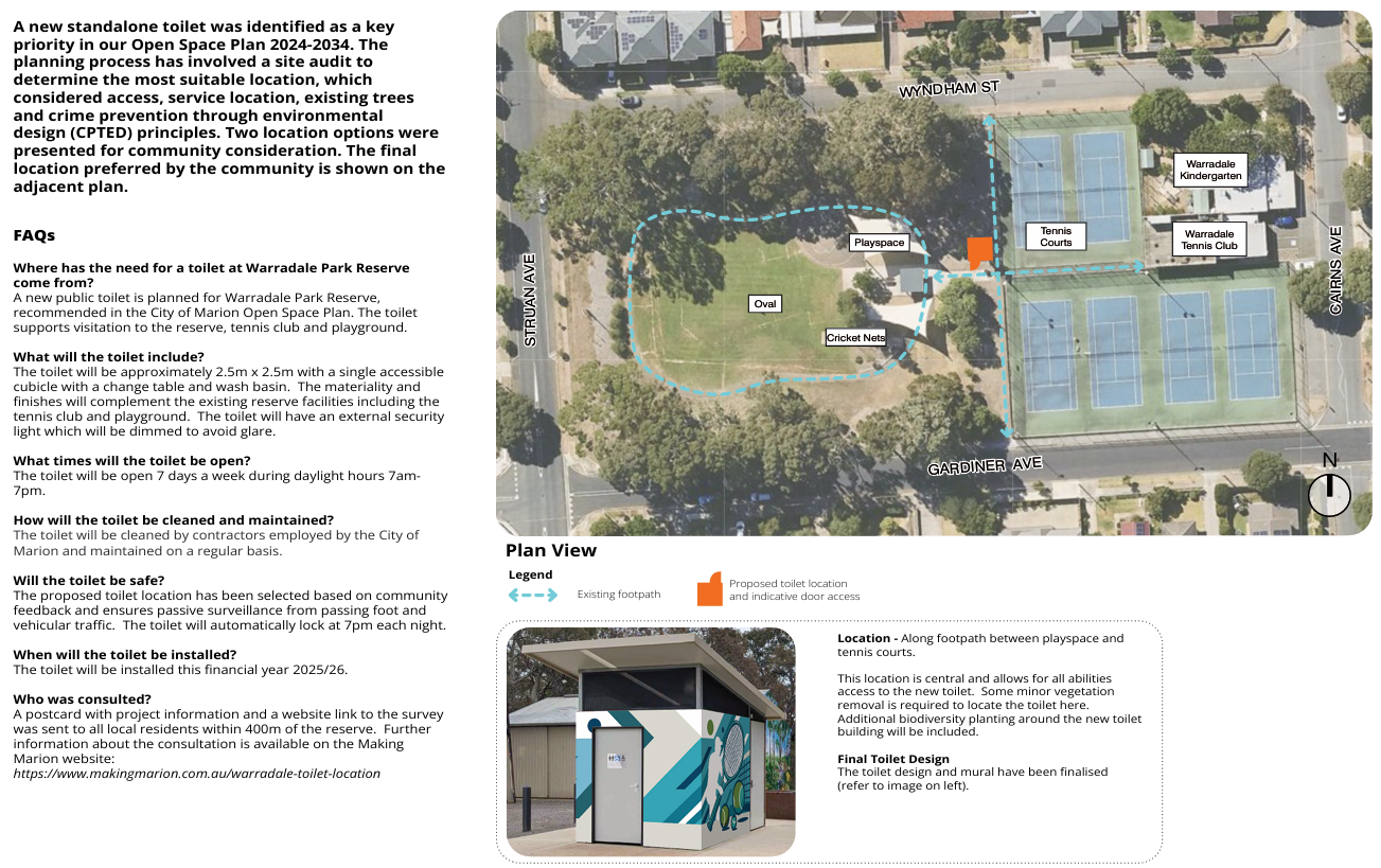 A new public toilet is planned for Warradale Park Reserve, recommended in the City of Marion Open Space Plan. The toilet supports visitation to the reserve, tennis club and playground.